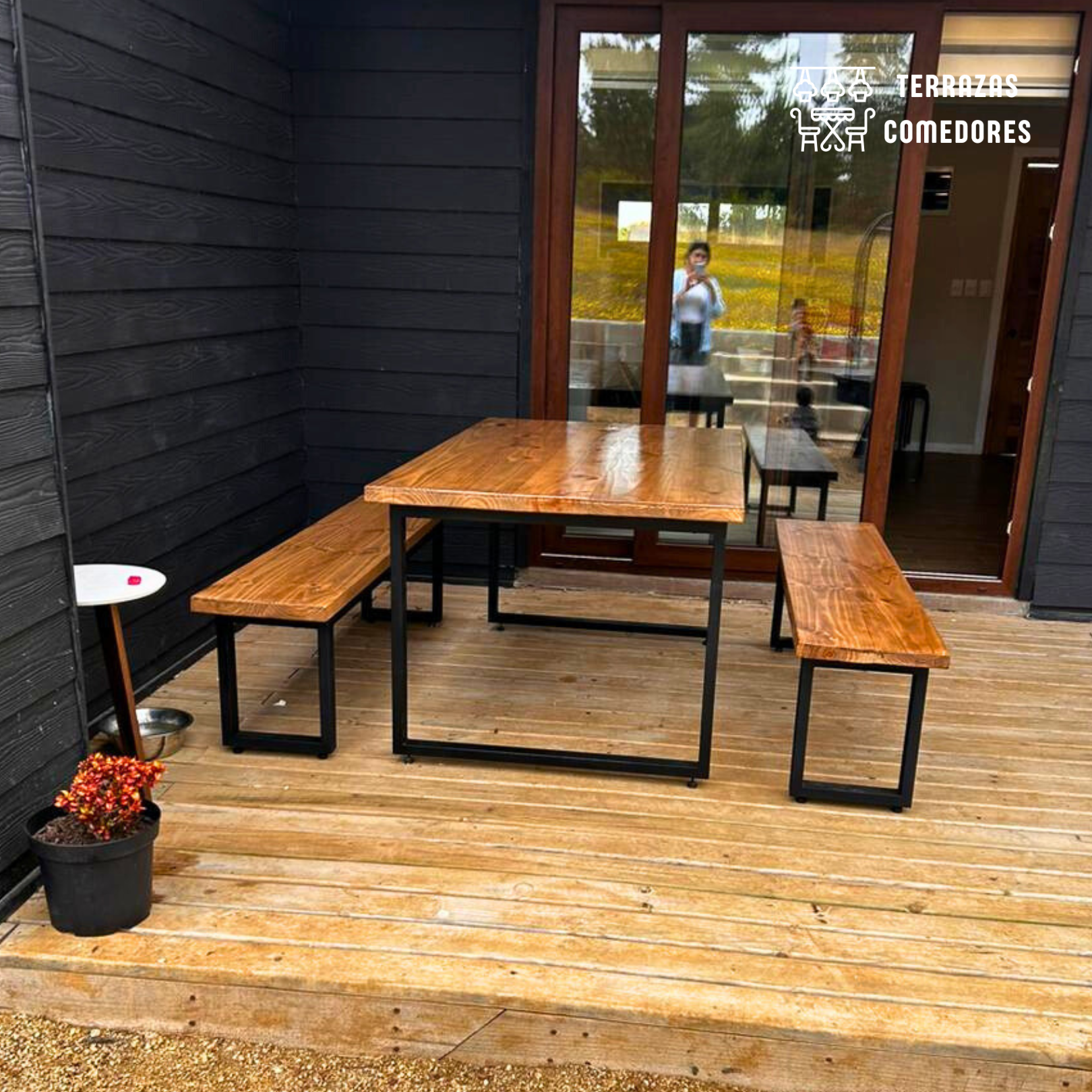 Eleva el estilo de tu terraza con este impresionante comedor con bancas, diseñado para combinar robustez y elegancia. Nuestra mesa está fabricada con vigas de pino Radiata de 2 pulgadas de grosor, destacando por su durabilidad y carácter único. Las bancas son fabricadas con las mismas vigas de la cubierta.