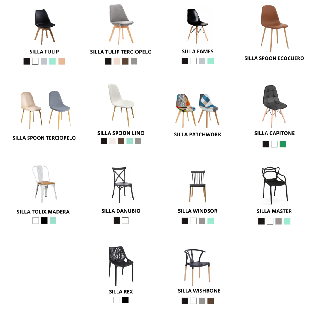 En cuanto a las sillas, tenemos mas de 10 modelos disponibles a elección. todas ellas de la mejor calidad y resistencia.