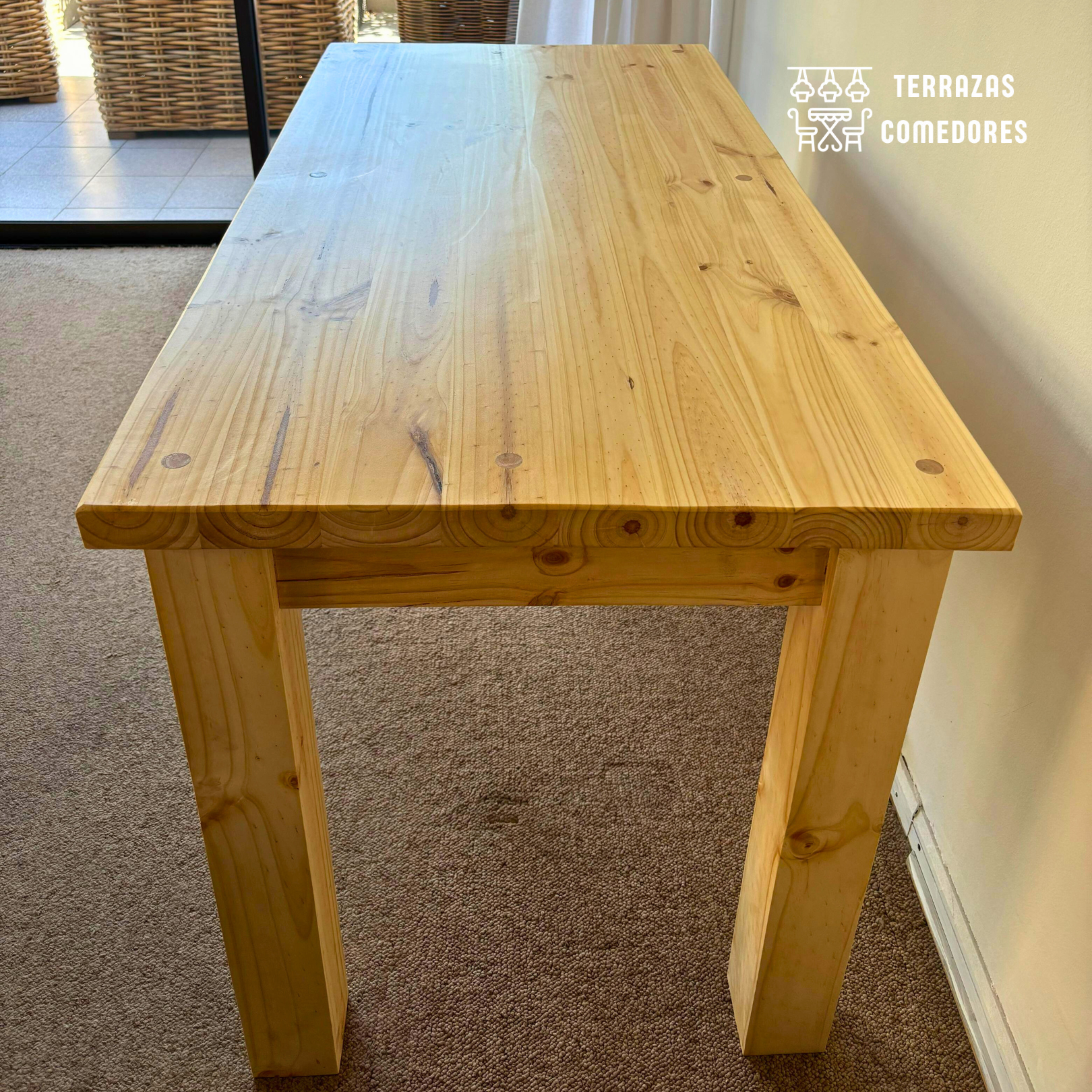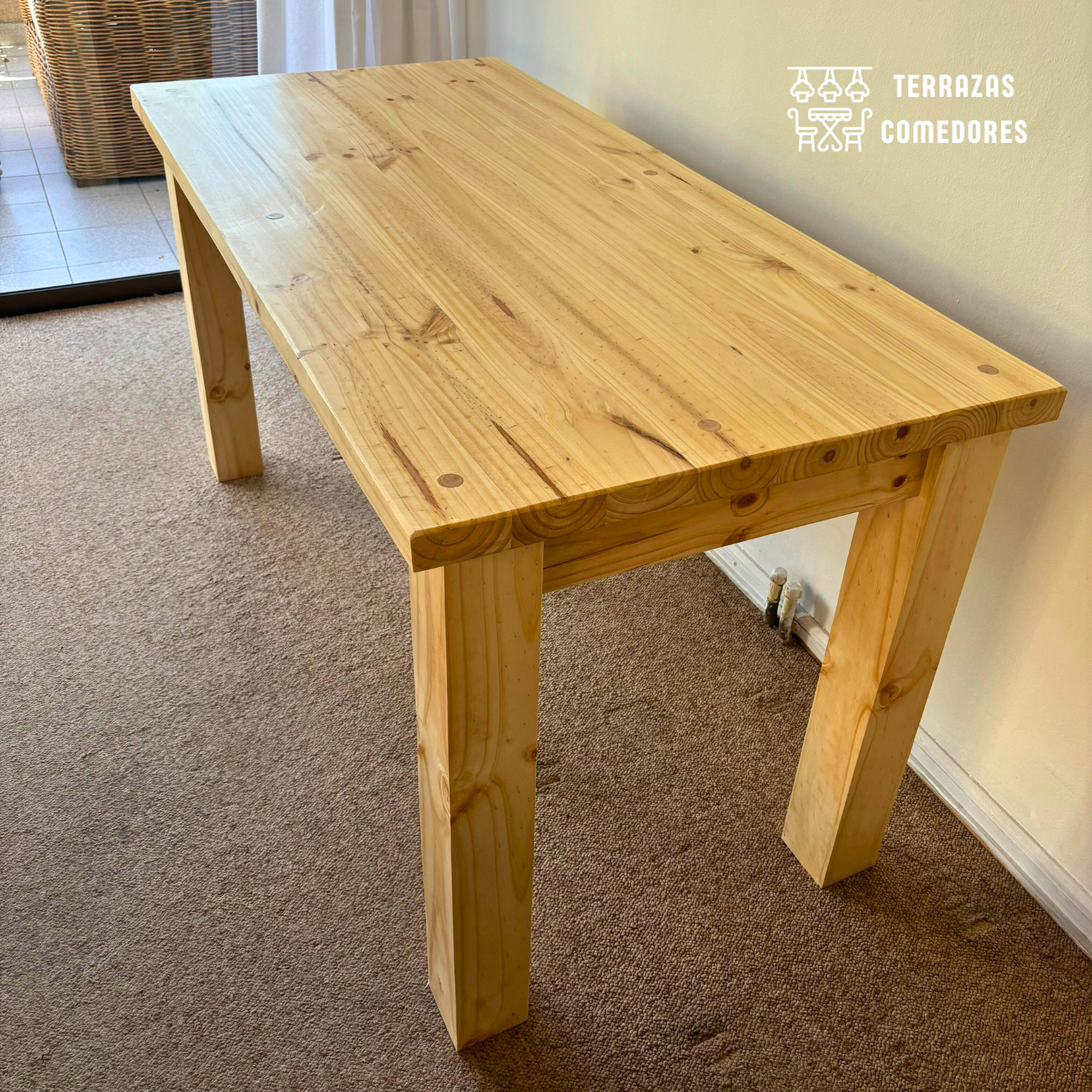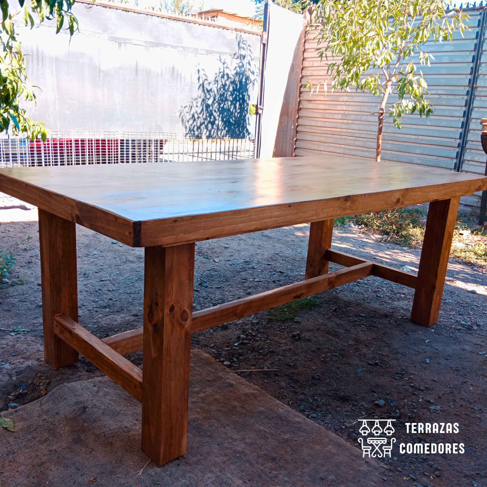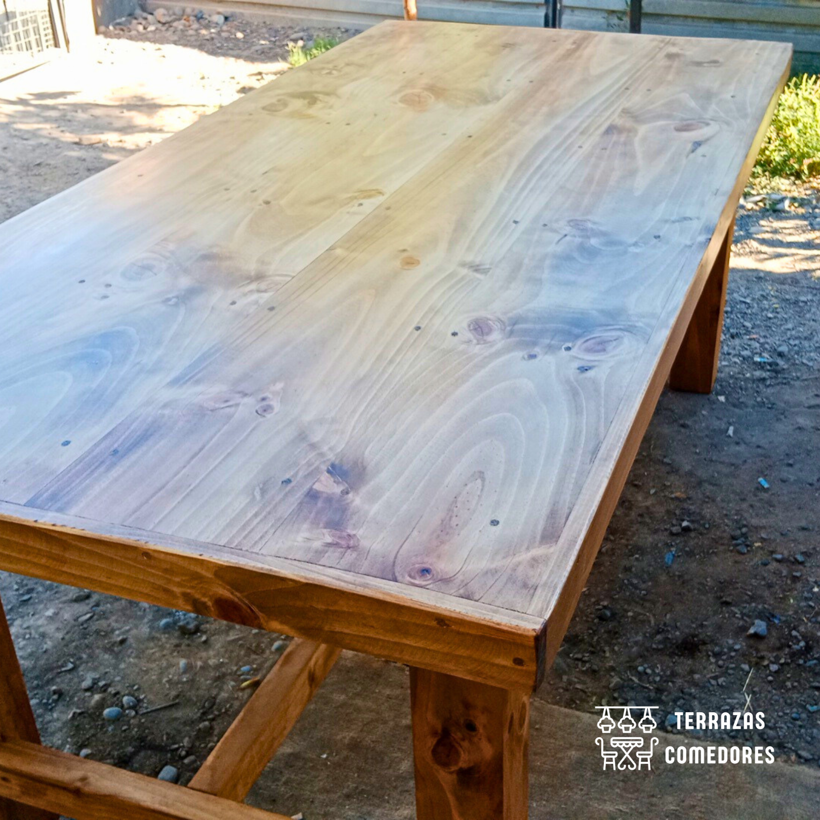 Nuestra mesa rústica modelo campo está fabricada con vigas de pino de 2 pulgadas, cada pieza ha sido meticulosamente cepillada y prensada para garantizar una estructura robusta y resistente. El uso del protector de madera Cerestain, junto con un acabado vitrificado y pulido, asegura una protección excepcional y un brillo que resalta su impecable artesanía.
