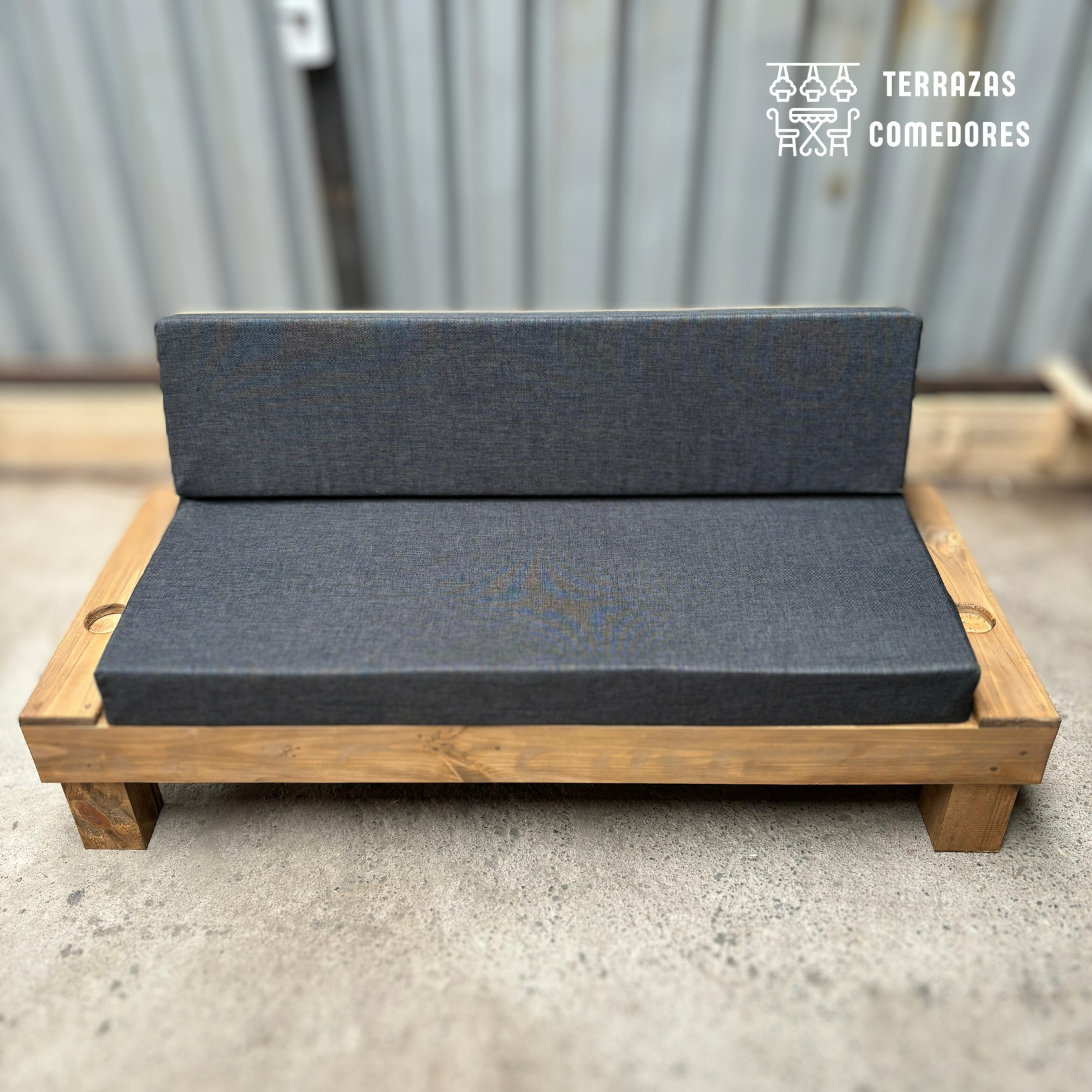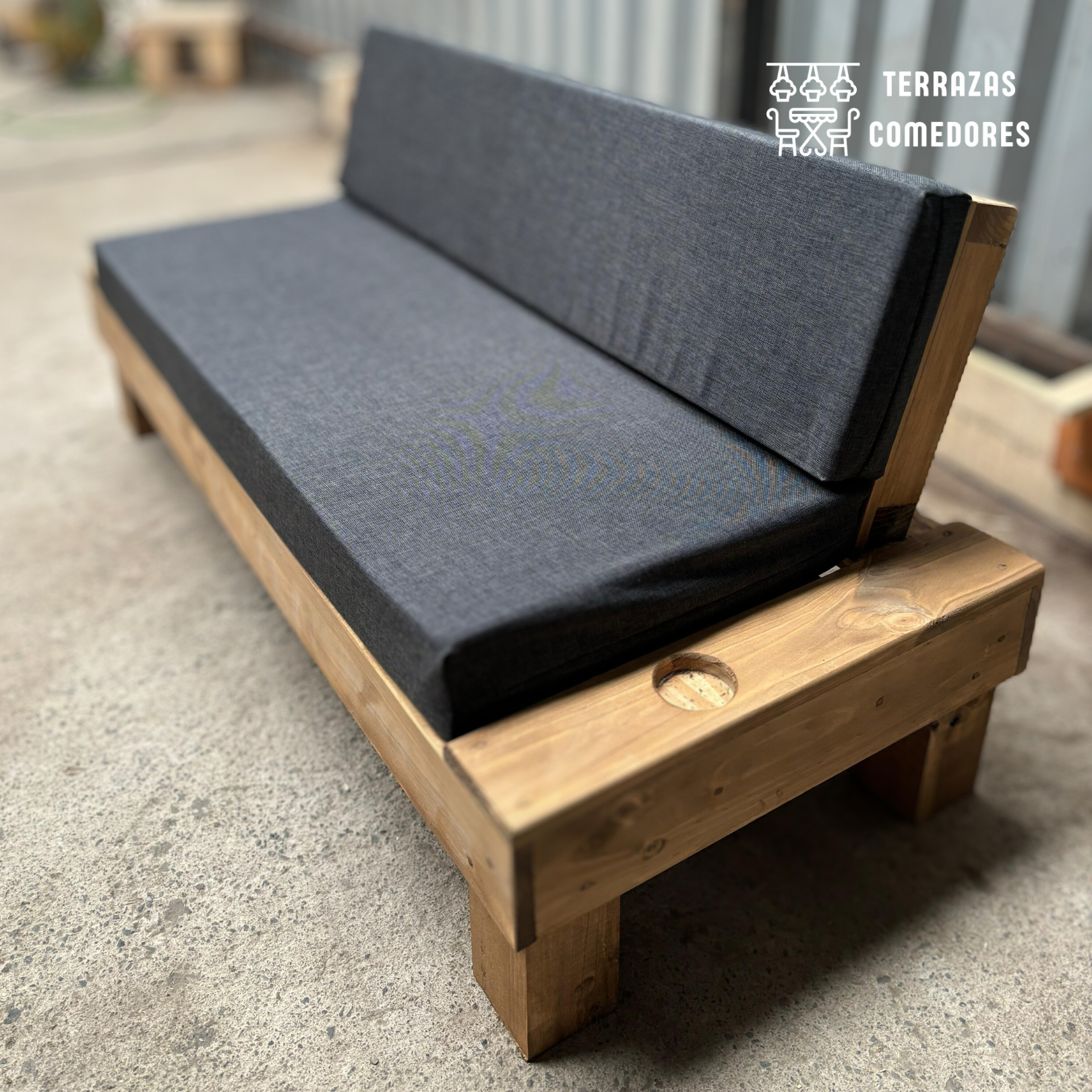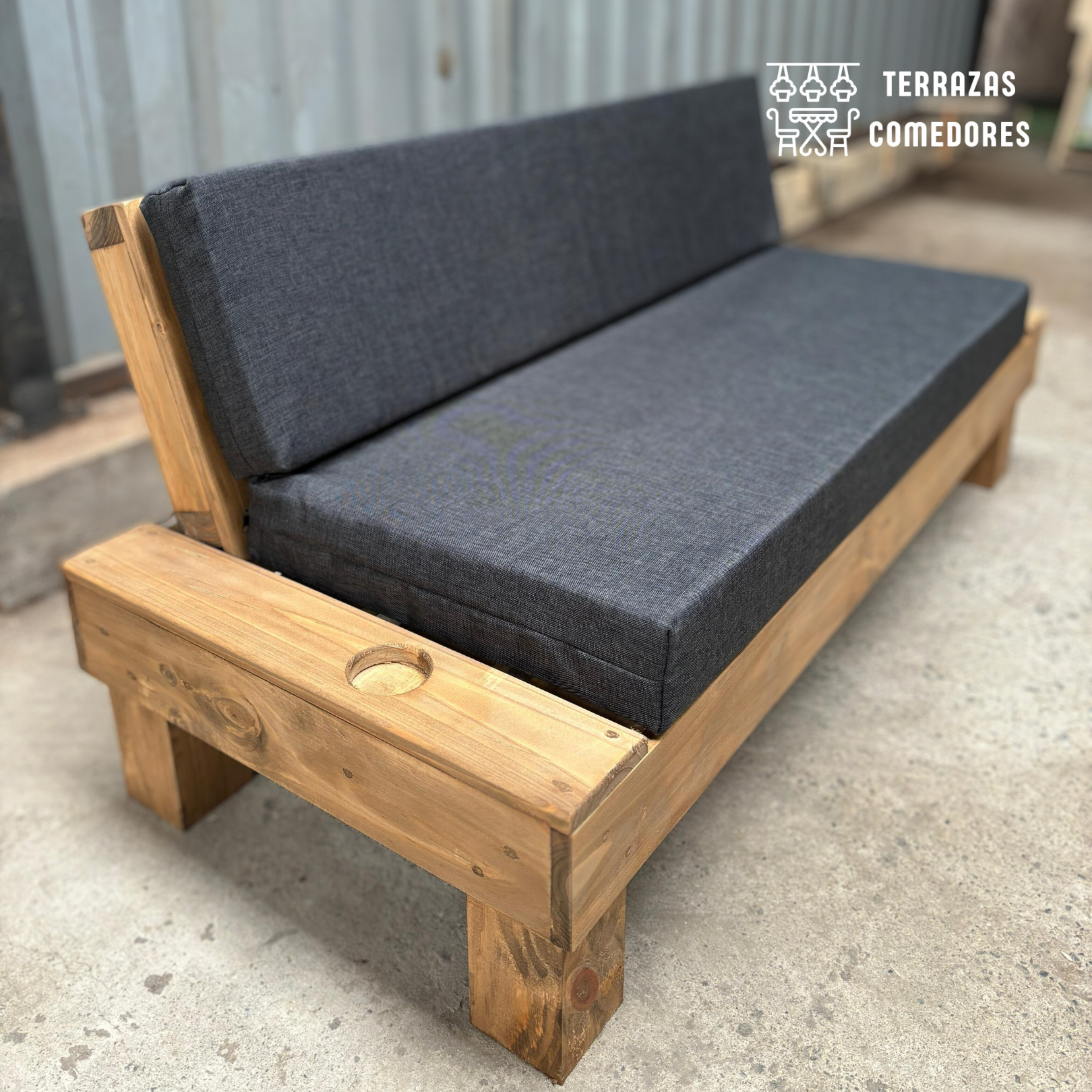 El Sofá Rustico Posavasos es versátil y se adapta perfectamente a cualquier espacio exterior, ya sea una terraza, jardín o balcón.