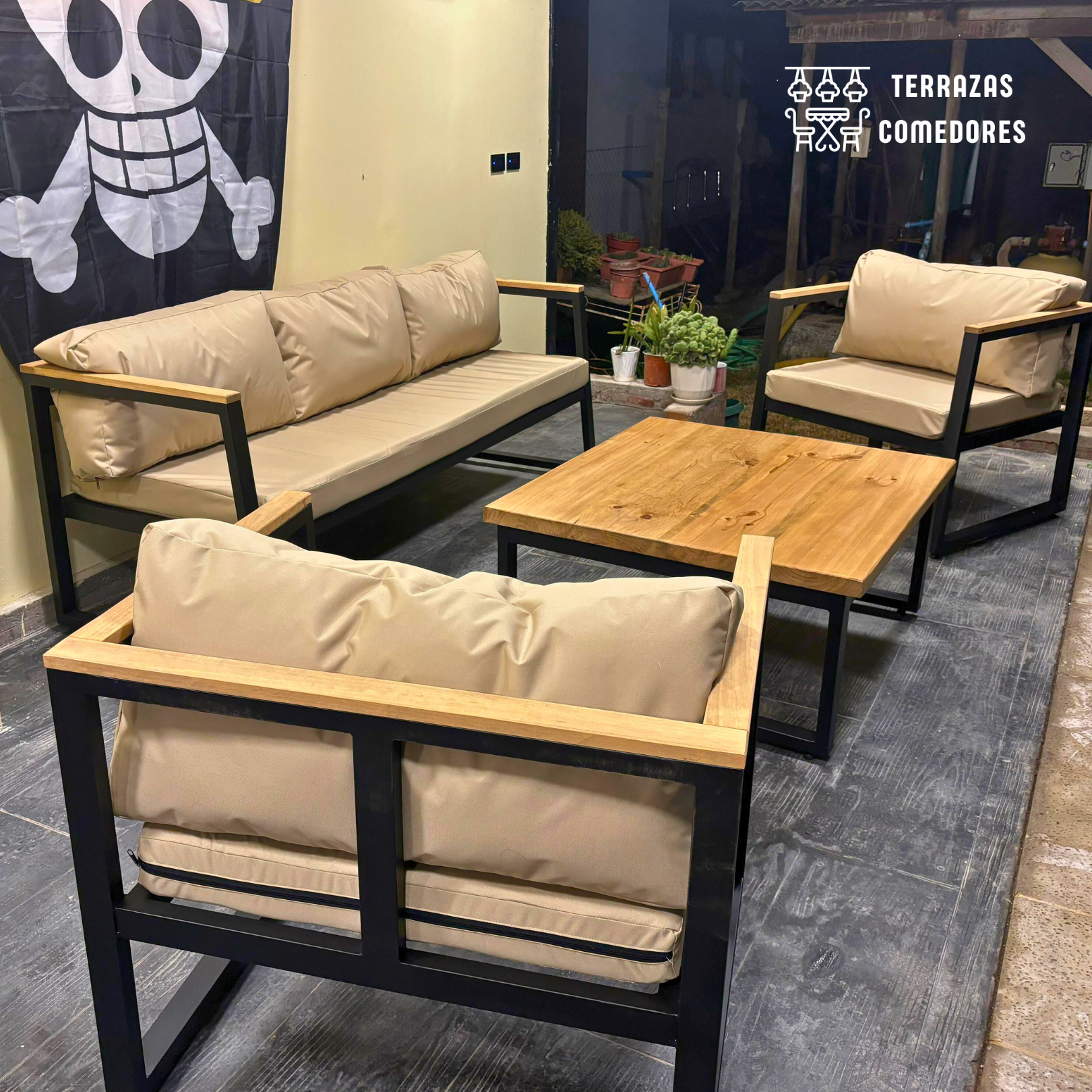 - Dimensiones: la terraza industrial Incluye dos sofás tipo sitial de 75x70x45 cm cada uno, un sofá amplio de 190x75x45 cm, y una mesa de centro de 100x90x45 cm. La terraza industrial es perfecta tanto para reuniones íntimas como para eventos más grandes al aire libre.