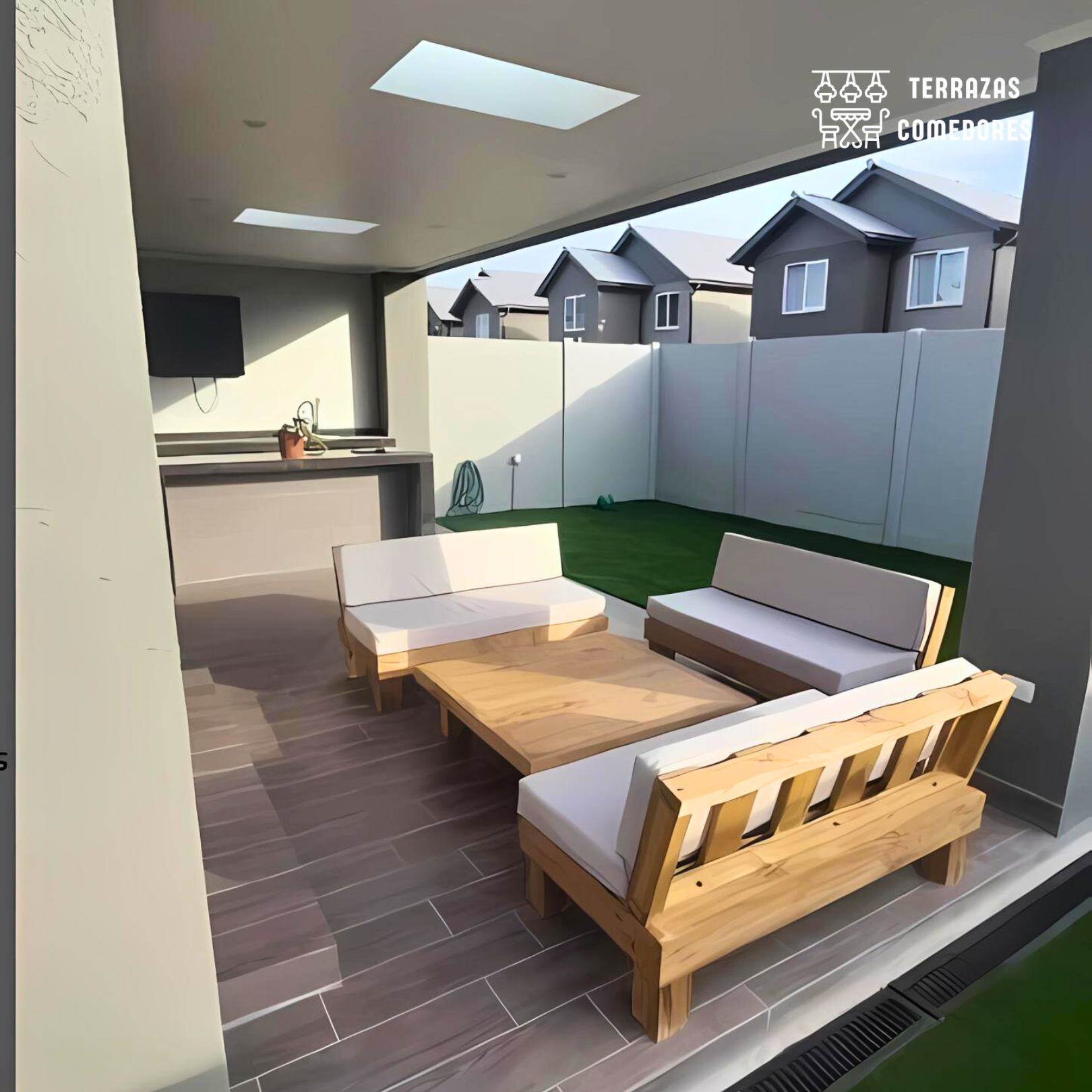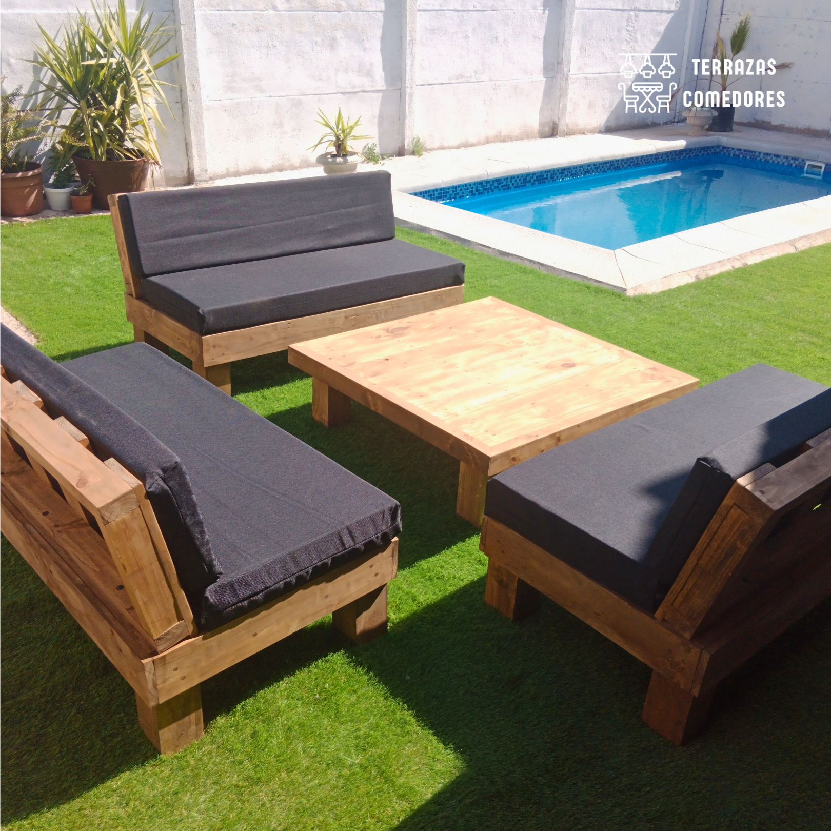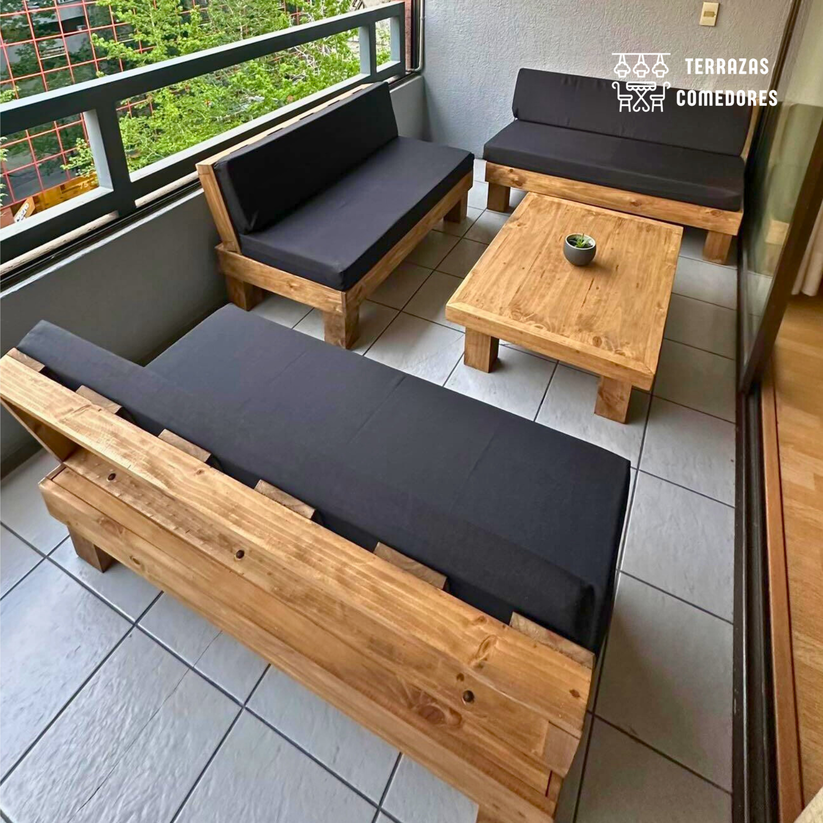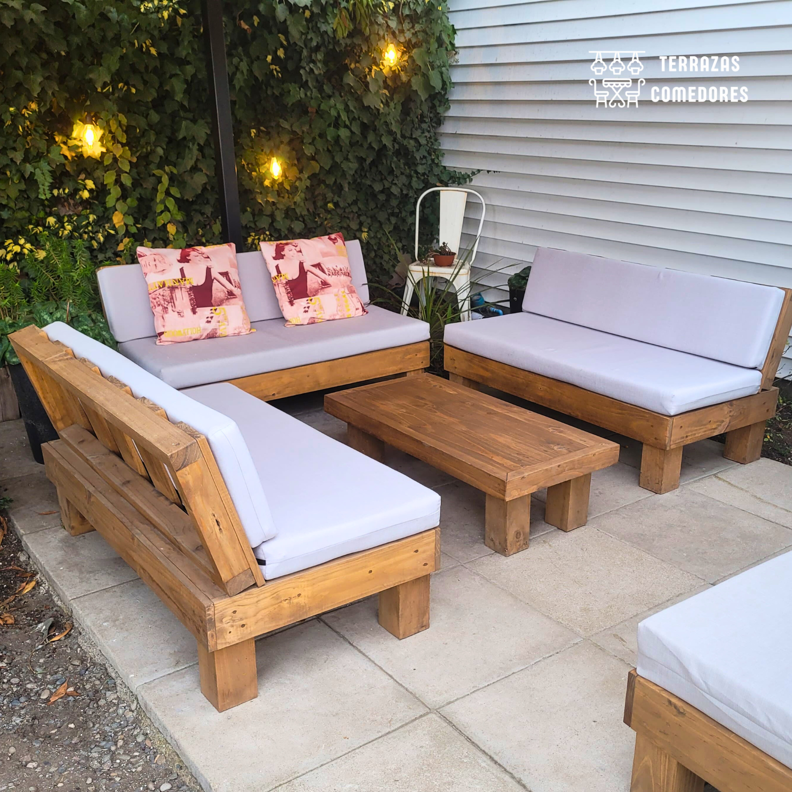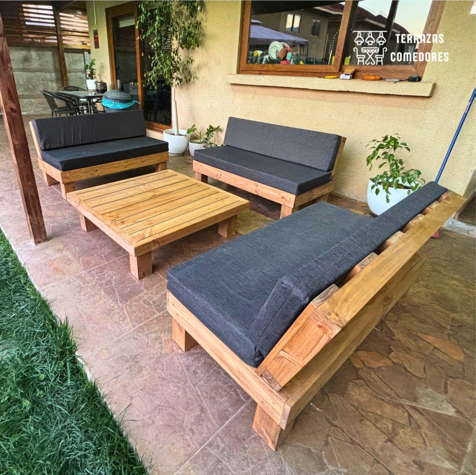 Nuestro juego de terraza tradicional incluye 3 sofás de 125x65x40 cm y una mesa de centro de 100x100x30 cm, todos fabricados con el robusto y duradero Pino Radiata, pulido y tratado con Cerestain en el color de tu elección. Este acabado no solo resalta la belleza natural de la madera, sino que también asegura una resistencia excepcional a las condiciones exteriores, garantizando que tu mobiliario mantenga su esplendor año tras año.